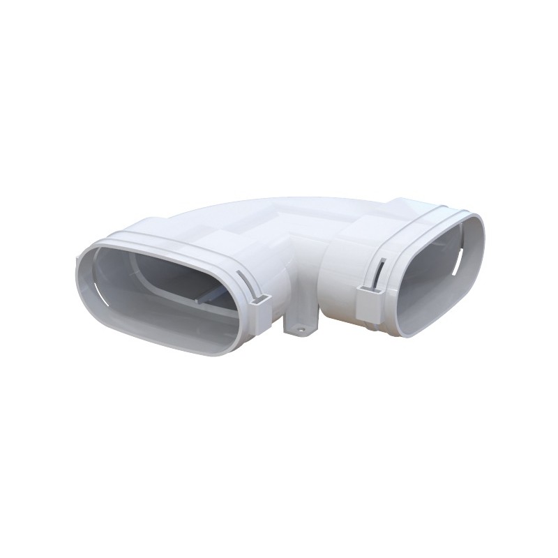 Łączenie kanałów 52 mm pod kątem 90° w poziomi. Dzięki zastosowaniu uchwytów mocujących (dołączony do zestawu) pozwala na trwałe i szczelne połączenie ze sobą kanałów elastycznych 52 mm.